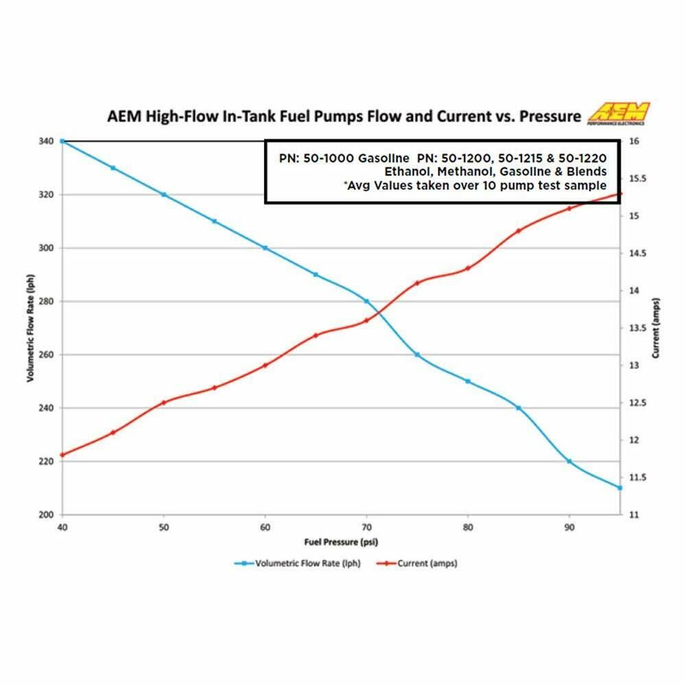 The AEM 340LPH High Flow In-Tank Fuel Pump (PN 50-1000) flows 340 lph (84 gph) at 40 PSI and is capable of supporting over 1,000 HP at 43 PSI.* Please see the flow curves and current draw vs. fuel pressure graphs on the specs tab for more information.