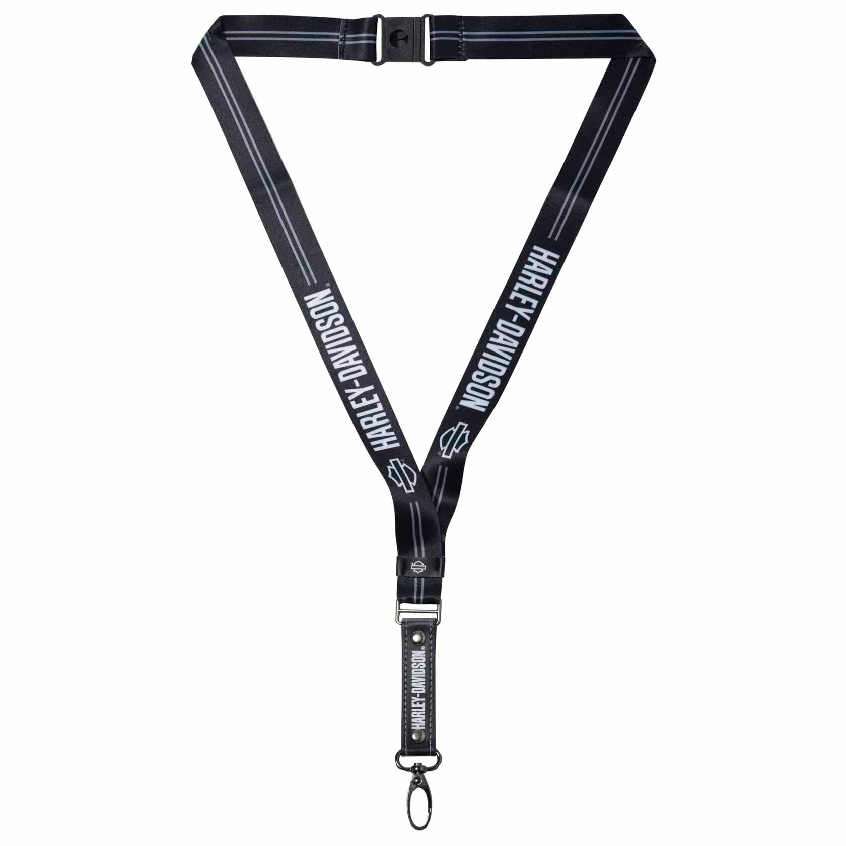 - Harley-Davidson Silhouette Bar & Shield with Text Script on both Lanyard fabric and at bottom of Lanyard where key chain attachment clasp is