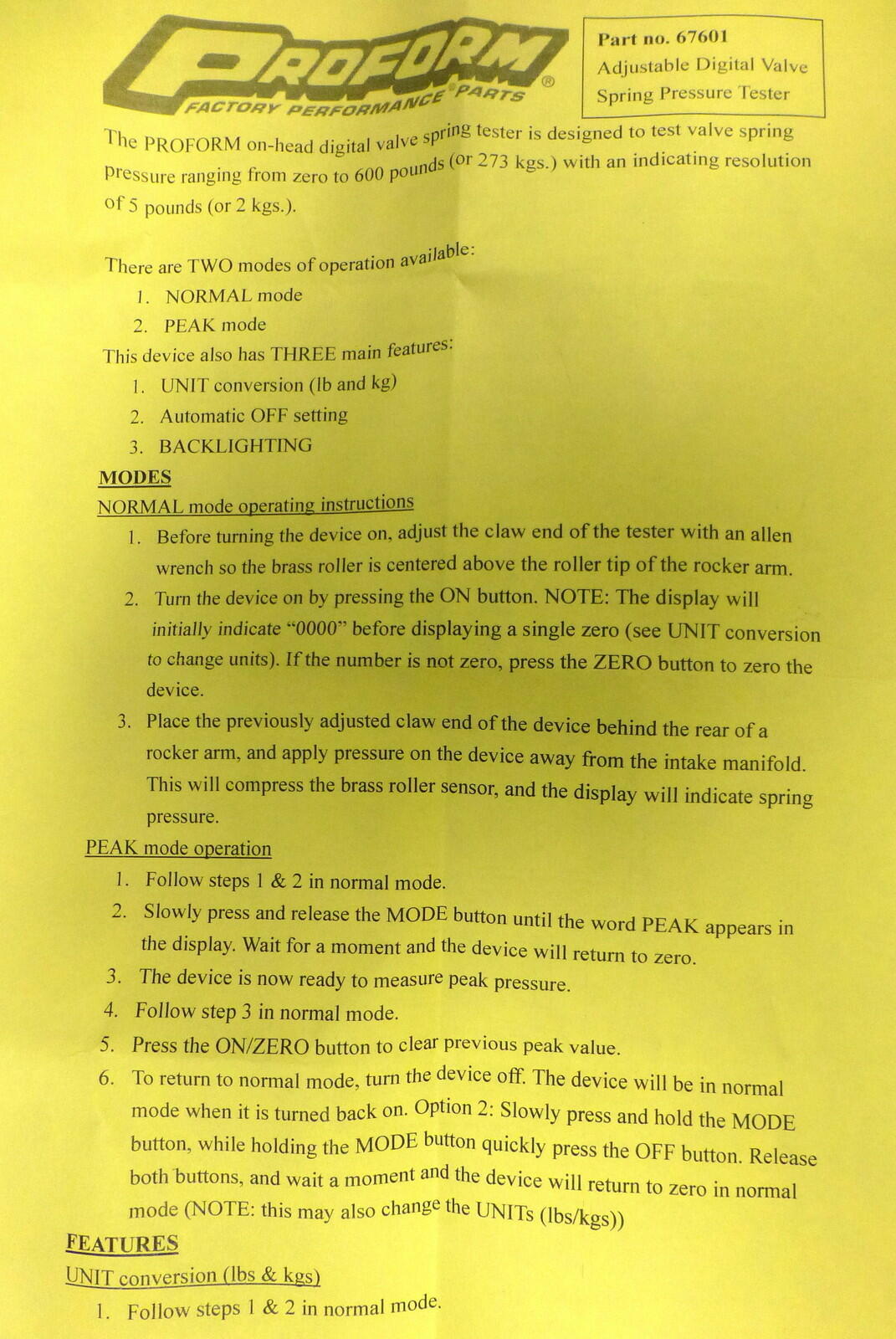 Proform 67601 Digital Adjustable Valve Spring Pressure Tester Range 0-600 lbs
